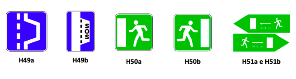 > H50a, H50b, H51a e H51b - Saída de emergência: indicação da localização de uma saída de emergência e da direção e distância à saída de emergência mais próxima.