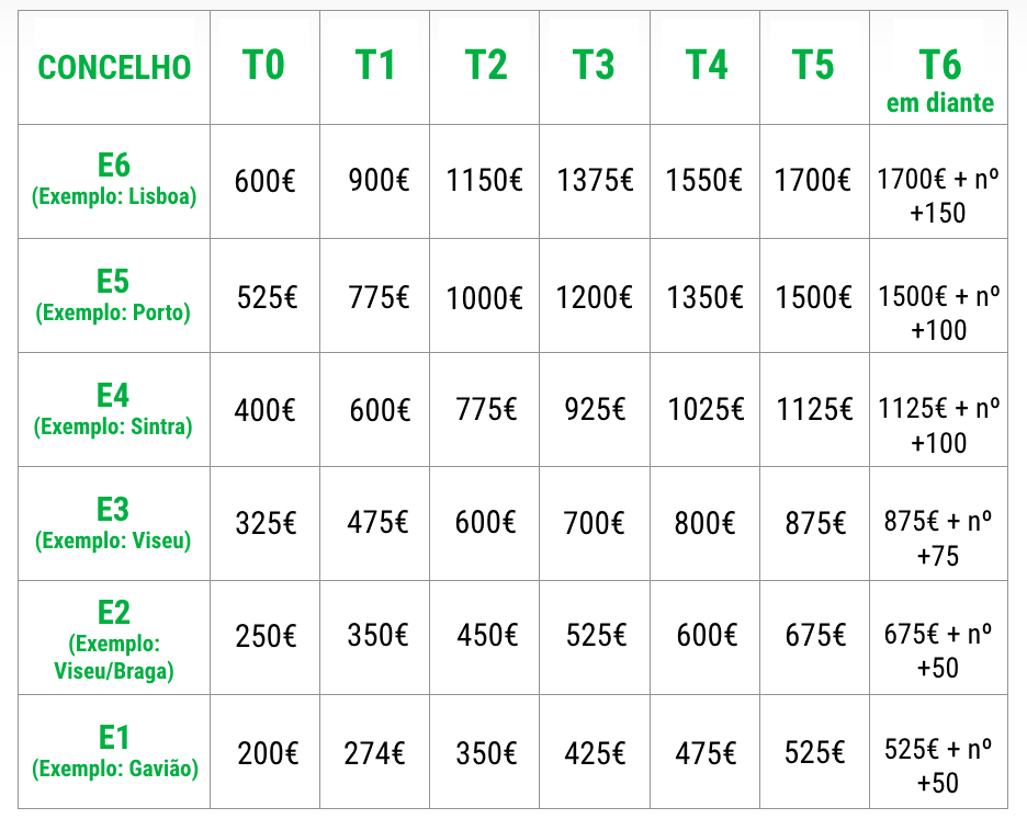 Nota: Nas casas com mais de 5 assoalhadas (T5), "n.º" é igual ao número de quartos acima de cinco. Assim, um T6 em Lisboa não pode ser arrendado por mais de 1 850 euros, enquanto no Porto o teto máximo é 1 600 euros.
